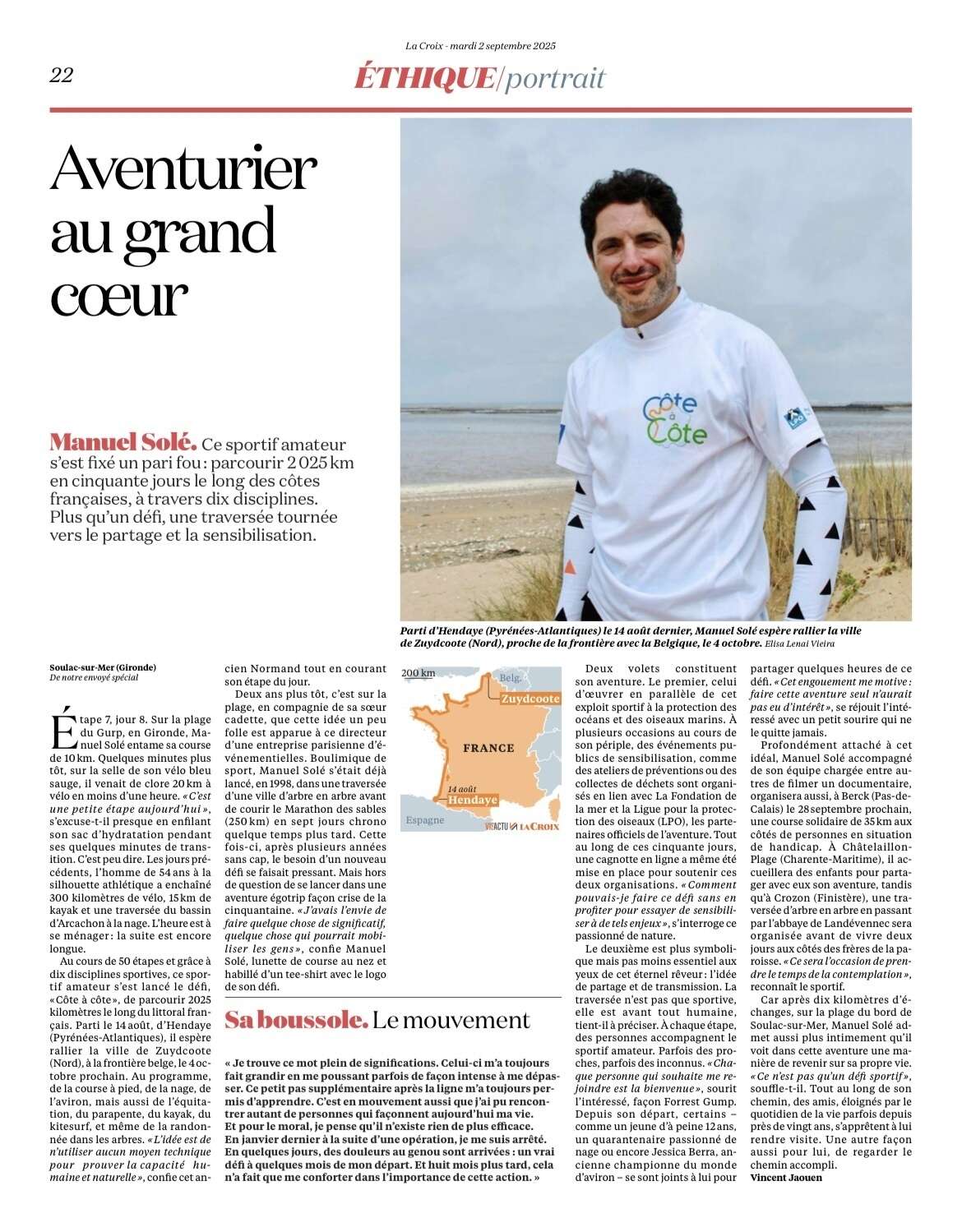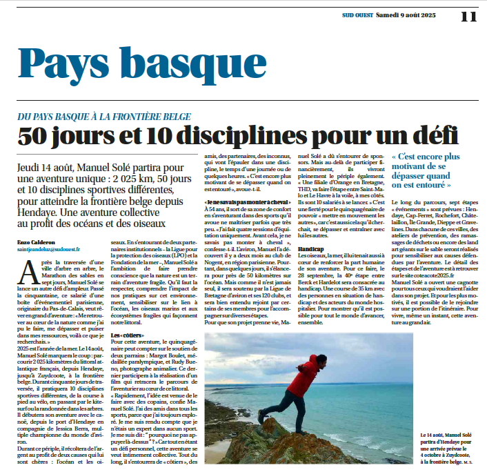 Côte à Côte est un défi personnel, au cœur de la nature : parcourir 2025 Km en 50 jours, en pratiquant 10 disciplines sportives entre terre, mer et ciel.
